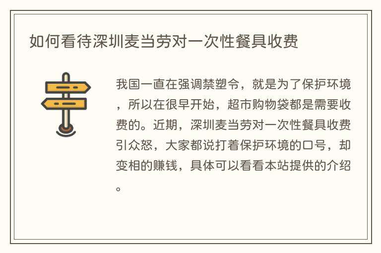 我国一直在强调禁塑令,就是为了保护环境,所以在很早开始,超市购物袋都是需要收费的。近期,深圳麦当劳对一次性餐具收费引众怒,大家都说打着保护环境的口号,却变相的赚钱,具体可以看看本站提供的介绍。