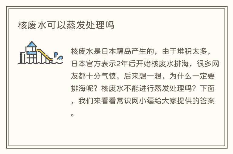 核废水是日本福岛产生的,由于堆积太多,日本官方表示2年后开始核废水排海,很多网友都十分气愤,后来想一想,为什么一定要排海呢?核废水不能进行蒸发处理吗?下面,我们来看看常识网小编给大家提供的答案。