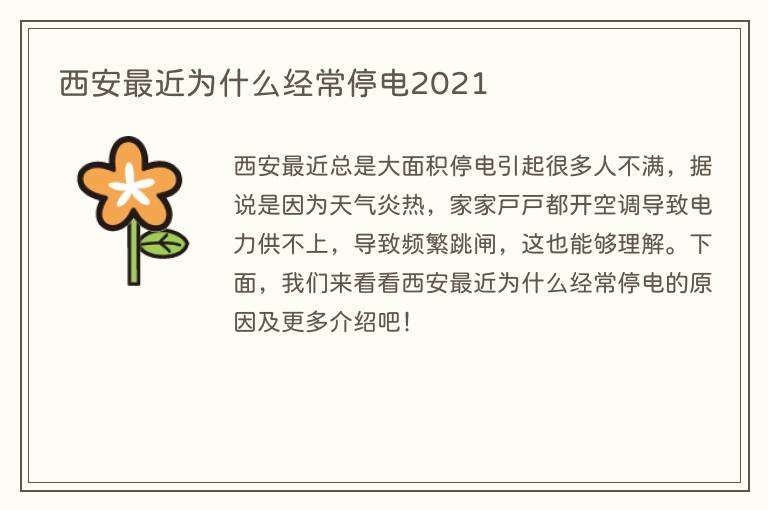 西安最近总是大面积停电引起很多人不满,据说是因为天气炎热,家家户户都开空调导致电力供不上,导致频繁跳闸,这也能够理解。下面,我们来看看西安最近为什么经常停电的原因及更多介绍吧!