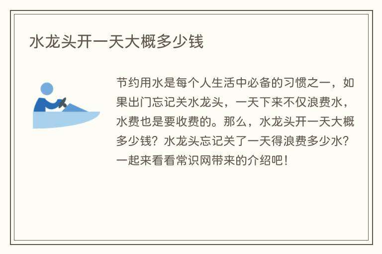 节约用水是每个人生活中必备的习惯之一,如果出门忘记关水龙头,一天下来不仅浪费水,水费也是要收费的。那么,水龙头开一天大概多少钱?水龙头忘记关了一天得浪费多少水?一起来看看常识网带来的介绍吧!