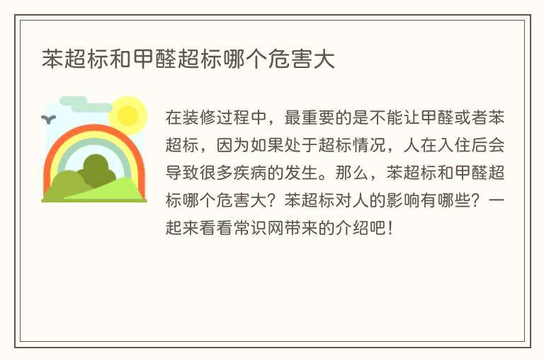 在装修过程中,最重要的是不能让甲醛或者苯超标,因为如果处于超标情况,人在入住后会导致很多疾病的发生。那么,苯超标和甲醛超标哪个危害大?苯超标对人的影响有哪些?一起来看看常识网带来的介绍吧!