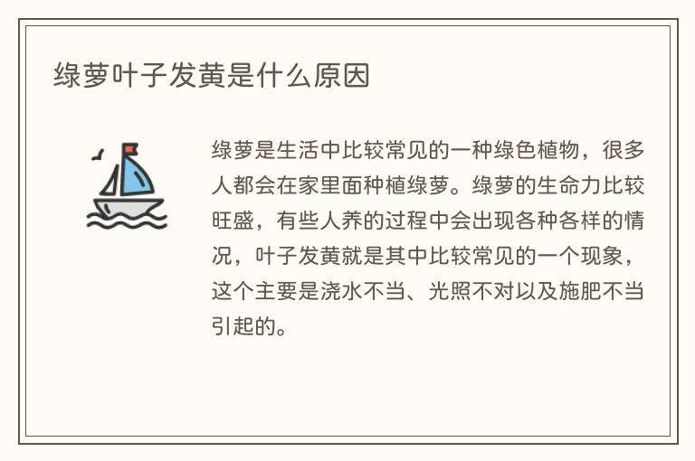 绿萝养殖施肥过多、浓度过大,或不缺肥都可能造成绿锣叶子发黄,如果绿萝是施肥过少则需要进行补肥料,施肥过多则可以更换泥土。
