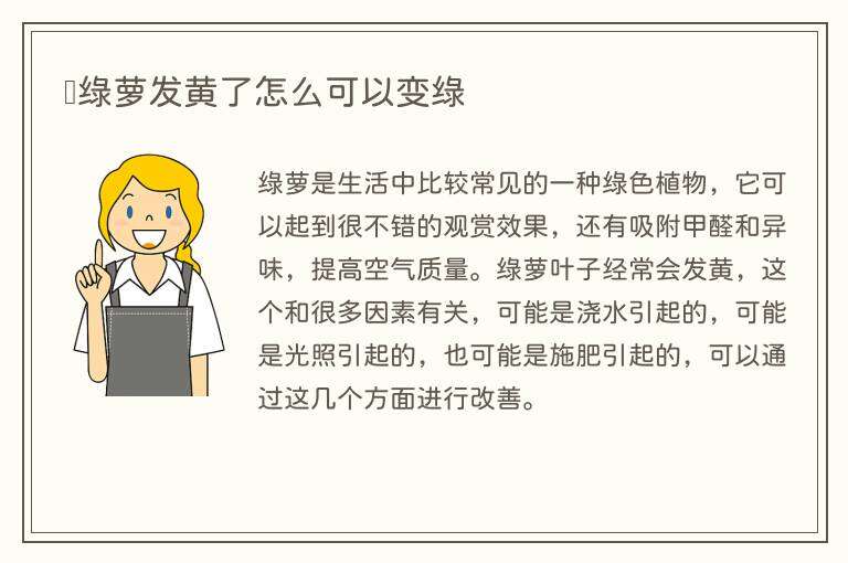 1、绿萝叶子变黄时如何变绿取决于变黄的原因。如果是施肥不足造成的,可以额外施肥,并使用易腐肥料。