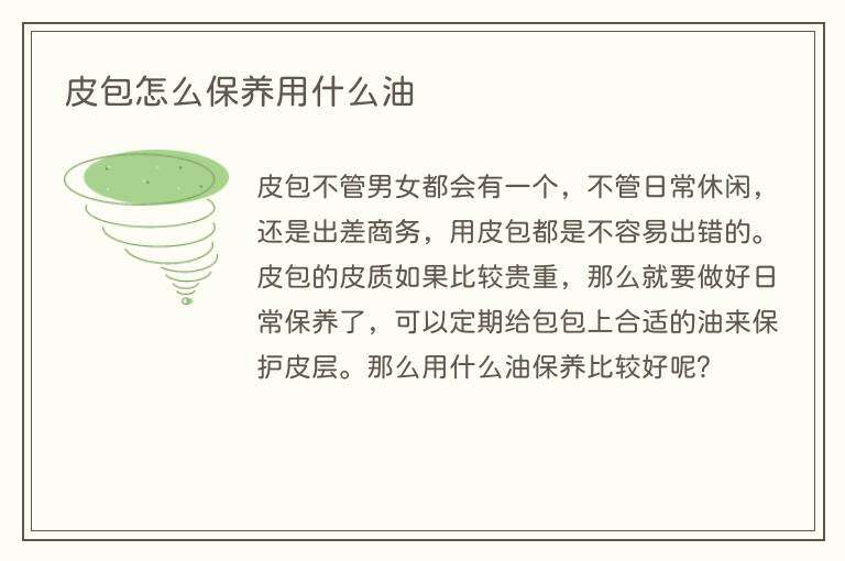 皮包不管男女都会有一个,不管日常休闲,还是出差商务,用皮包都是不容易出错的。皮包的皮质如果比较贵重,那么就要做好日常保养了,可以定期给包包上合适的油来保护皮层。那么用什么油保养比较好呢?