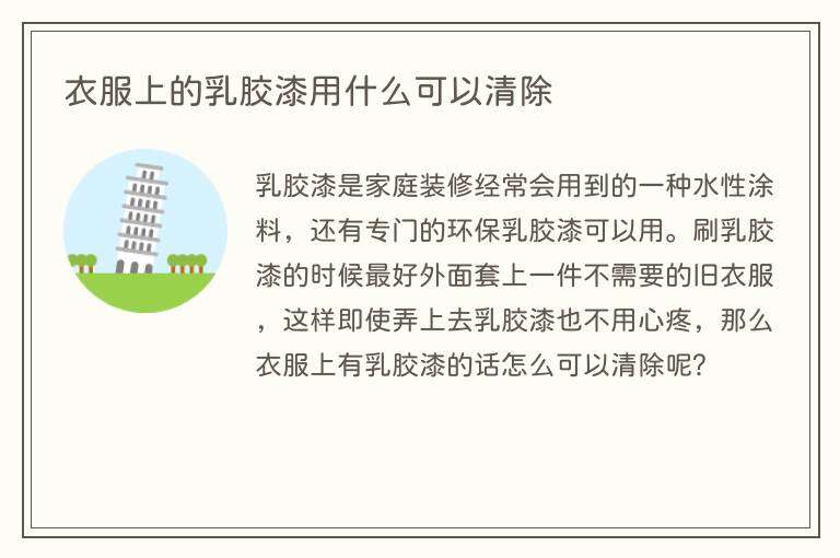 乳胶漆是家庭装修经常会用到的一种水性涂料,还有专门的环保乳胶漆可以用。刷乳胶漆的时候最好外面套上一件不需要的旧衣服,这样即使弄上去乳胶漆也不用心疼,那么衣服上有乳胶漆的话怎么可以清除呢?