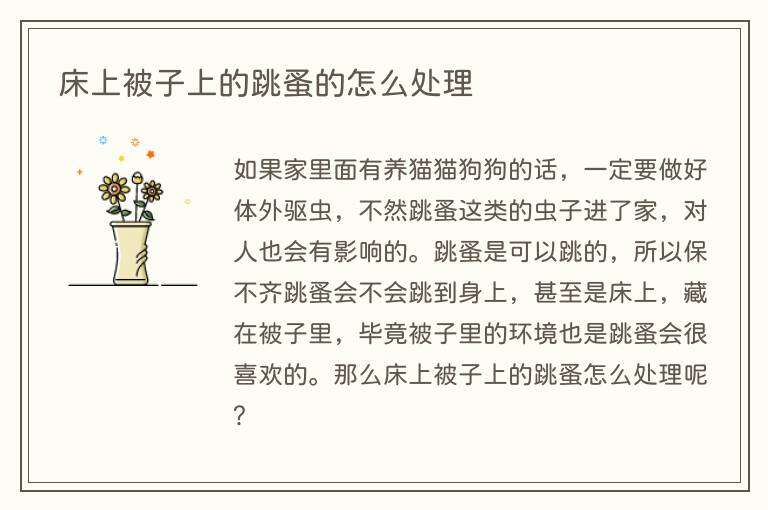 如果家里面有养猫猫狗狗的话,一定要做好体外驱虫,不然跳蚤这类的虫子进了家,对人也会有影响的。跳蚤是可以跳的,所以保不齐跳蚤会不会跳到身上,甚至是床上,藏在被子里,毕竟被子里的环境也是跳蚤会很喜欢的。那么床上被子上的跳蚤怎么处理呢?