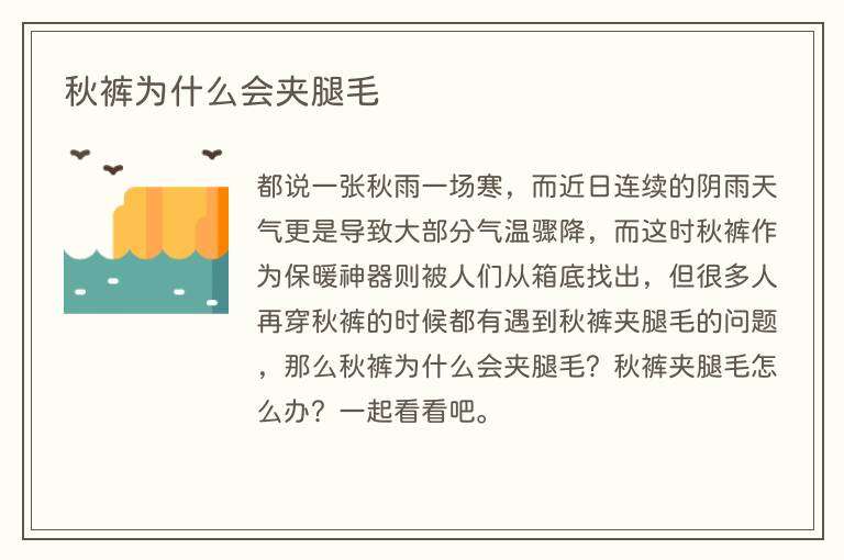 都说一张秋雨一场寒,而近日连续的阴雨天气更是导致大部分气温骤降,而这时秋裤作为保暖神器则被人们从箱底找出,但很多人再穿秋裤的时候都有遇到秋裤夹腿毛的问题,那么秋裤为什么会夹腿毛?秋裤夹腿毛怎么办?一起看看吧。