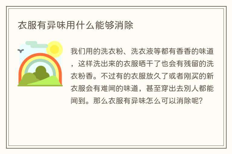 我们用的洗衣粉、洗衣液等都有香香的味道,这样洗出来的衣服晒干了也会有残留的洗衣粉香。不过有的衣服放久了或者刚买的新衣服会有难闻的味道,甚至穿出去别人都能闻到。那么衣服有异味怎么可以消除呢?