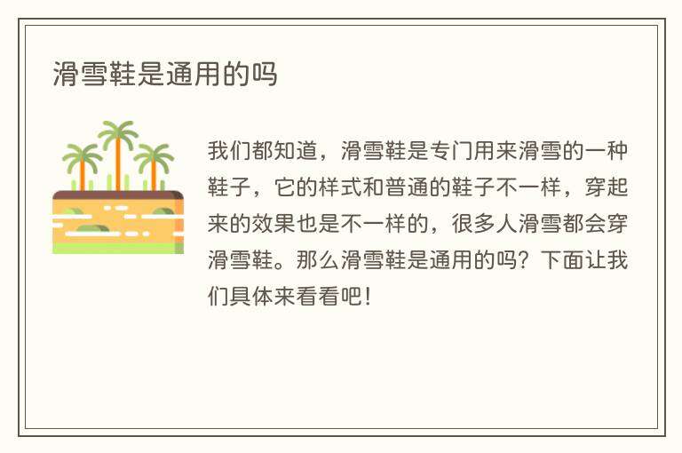 我们都知道,滑雪鞋是专门用来滑雪的一种鞋子,它的样式和普通的鞋子不一样,穿起来的效果也是不一样的,很多人滑雪都会穿滑雪鞋。那么滑雪鞋是通用的吗?下面让我们具体来看看吧!