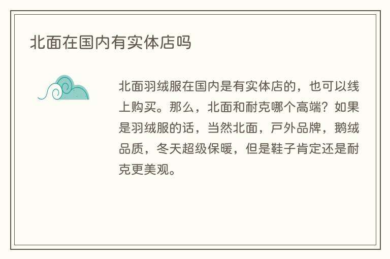 北面羽绒服在国内是有实体店的,也可以线上购买。那么,北面和耐克哪个高端?如果是羽绒服的话,当然北面,户外品牌,鹅绒品质,冬天超级保暖,但是鞋子肯定还是耐克更美观。