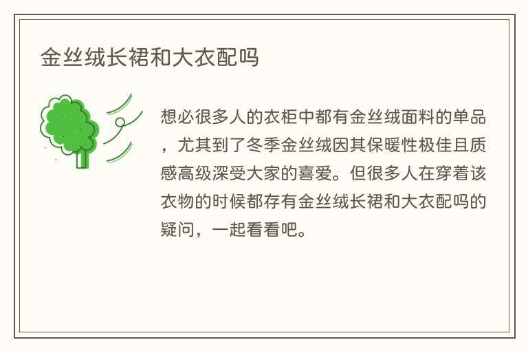 想必很多人的衣柜中都有金丝绒面料的单品,尤其到了冬季金丝绒因其保暖性极佳且质感高级深受大家的喜爱。但很多人在穿着该衣物的时候都存有金丝绒长裙和大衣配吗的疑问,一起看看吧。