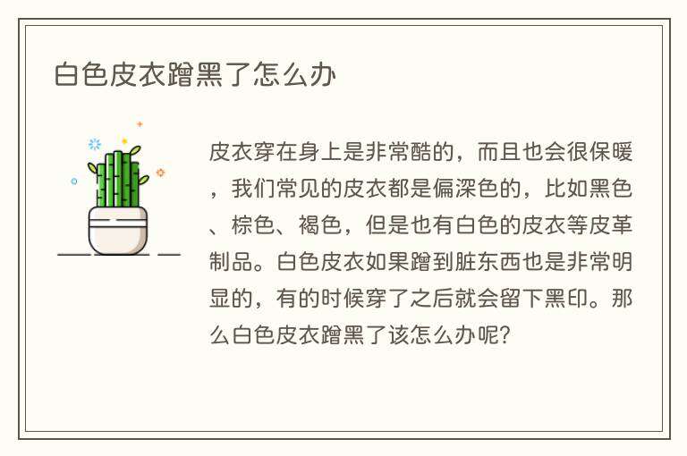 皮衣穿在身上是非常酷的,而且也会很保暖,我们常见的皮衣都是偏深色的,比如黑色、棕色、褐色,但是也有白色的皮衣等皮革制品。白色皮衣如果蹭到脏东西也是非常明显的,有的时候穿了之后就会留下黑印。那么白色皮衣蹭黑了该怎么办呢?