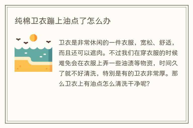 卫衣是非常休闲的一件衣服,宽松、舒适,而且还可以遮肉。不过我们在穿衣服的时候难免会在衣服上弄一些油渍等物资,时间久了就不好清洗,特别是有的卫衣非常厚。那么卫衣上有油点怎么清洗干净呢?