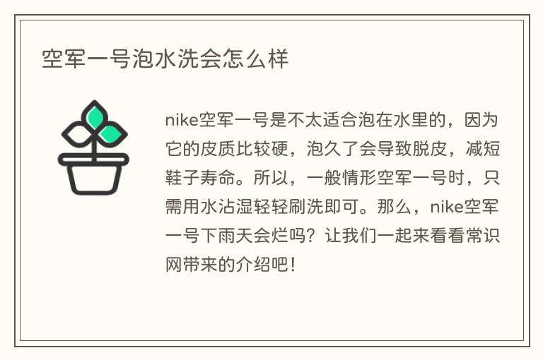 nike空军一号是不太适合泡在水里的,因为它的皮质比较硬,泡久了会导致脱皮,减短鞋子寿命。所以,一般情形空军一号时,只需用水沾湿轻轻刷洗即可。那么,nike空军一号下雨天会烂吗?让我们一起来看看常识网带来的介绍吧!