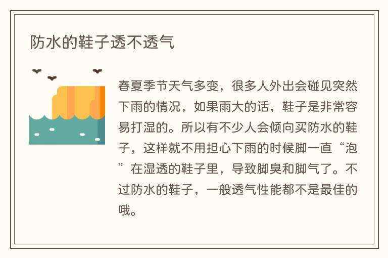 通常来说防水鞋子透气性比较一般,防水性能越好的话,透气性一般都不是很好。如果是下雨天穿的防水雨鞋、胶鞋等等通常都不会很透气,防水运动鞋的话,有的品牌产品透气性不错,但也有的透气性也不太好。防水运动鞋一般由具有良好防水效果的橡胶,人造革和动物皮革制成,防水,防尘,耐磨,保暖。如果鞋子穿了不透气,建议几双轮换着穿。