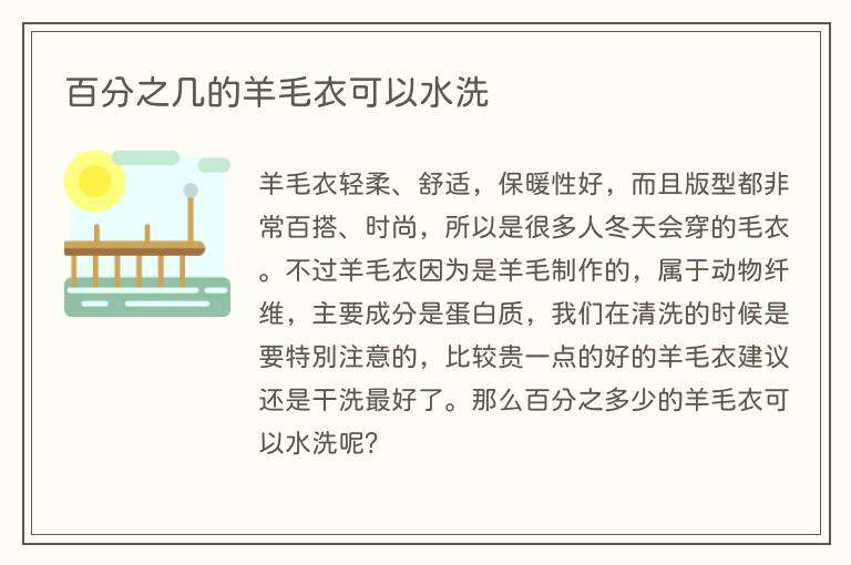 羊毛衣轻柔、舒适,保暖性好,而且版型都非常百搭、时尚,所以是很多人冬天会穿的毛衣。不过羊毛衣因为是羊毛制作的,属于动物纤维,主要成分是蛋白质,我们在清洗的时候是要特别注意的,比较贵一点的好的羊毛衣建议还是干洗最好了。那么百分之多少的羊毛衣可以水洗呢?
