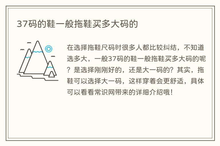 在选择拖鞋尺码时很多人都比较纠结,不知道选多大,一般37码的鞋一般拖鞋买多大码的呢?是选择刚刚好的,还是大一码的?其实,拖鞋可以选择大一码,这样穿着会更舒适,具体可以看看常识网带来的详细介绍哦!