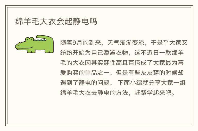 随着9月的到来,天气渐渐变凉,于是乎大家又纷纷开始为自己添置衣物,这不近日一款绵羊毛的大衣因其实穿性高且百搭成了大家最为喜爱购买的单品之一,但是有些友友穿的时候却遇到了静电的问题, 下面小编就分享大家一组绵羊毛大衣去静电的方法,赶紧学起来吧。