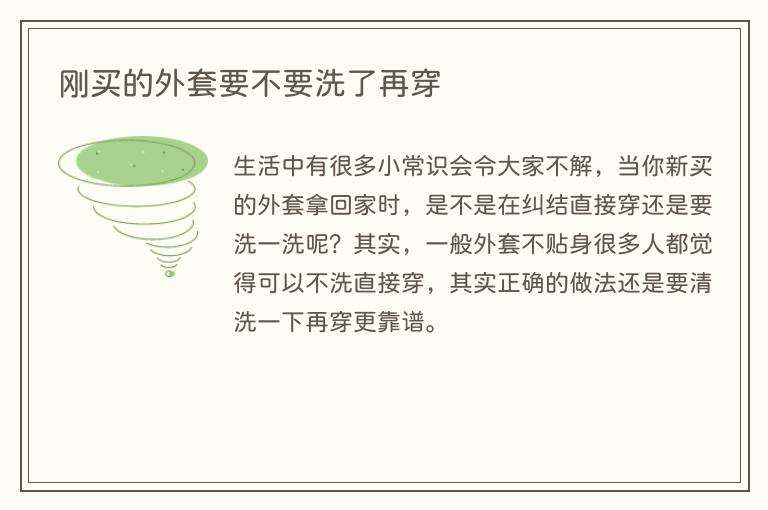 生活中有很多小常识会令大家不解,当你新买的外套拿回家时,是不是在纠结直接穿还是要洗一洗呢?其实,一般外套不贴身很多人都觉得可以不洗直接穿,其实正确的做法还是要清洗一下再穿更靠谱。