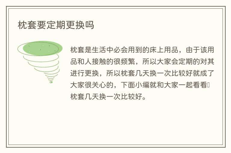枕套要定期更换吗是时下很多友友好奇的,就以往的个情况看是要这样子的,一般来讲枕套至少一周要换洗一次。很多人尤其是懒人都不会经常换床单和枕套,认为经常换衣服、洗澡就不用换了,其实这是错误的认识。建议您,为了减少病菌,最好一周清洗一次床单。经常换洗床单和枕套才能促进身体健康,每周清洗一次床单和枕套会让积聚在床上的残渣,细菌等无处藏身,空气呼吸起来就更安全。