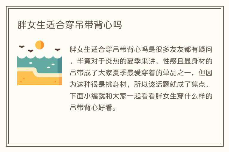 胖女生适合穿吊带背心吗是很多友友都有疑问,毕竟对于炎热的夏季来讲,性感且显身材的吊带成了大家夏季最爱穿着的单品之一,但因为这种很是挑身材,所以该话题就成了焦点,下面小编就和大家一起看看胖女生穿什么样的吊带背心好看。