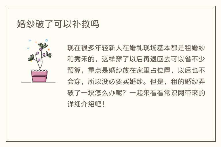 现在很多年轻新人在婚礼现场基本都是租婚纱和秀禾的,这样穿了以后再退回去可以省不少预算,重点是婚纱放在家里占位置,以后也不会穿,所以没必要买婚纱。但是,租的婚纱弄破了一块怎么办呢?一起来看看常识网带来的详细介绍吧!