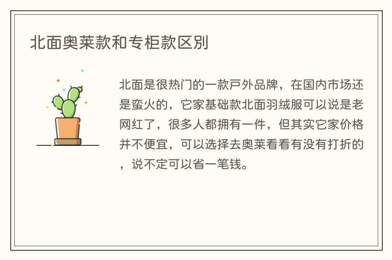 1、价格。北面奥莱款和专柜款最大的区别在于价格,北面奥莱款经常打折,价格会比较便宜,专柜款价格比较贵,比如北面男式棉服,专柜价¥1898,奥莱价¥540元。