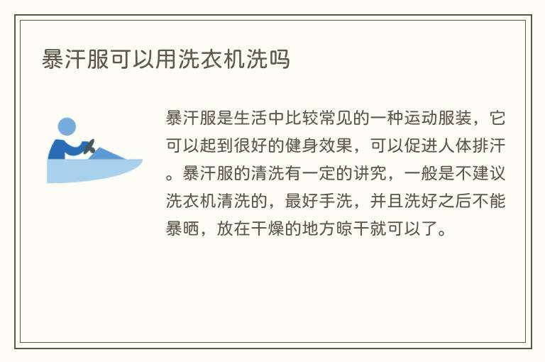 暴汗服是生活中比较常见的一种运动服装,它可以起到很好的健身效果,可以促进人体排汗。暴汗服的清洗有一定的讲究,一般是不建议洗衣机清洗的,最好手洗,并且洗好之后不能暴晒,放在干燥的地方晾干就可以了。