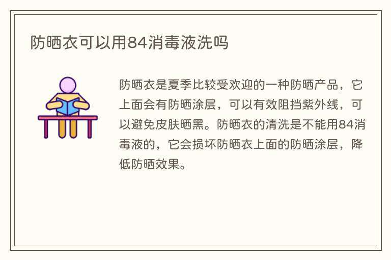 防晒衣是夏季比较受欢迎的一种防晒产品,它上面会有防晒涂层,可以有效阻挡紫外线,可以避免皮肤晒黑。防晒衣的清洗是不能用84消毒液的,它会损坏防晒衣上面的防晒涂层,降低防晒效果。