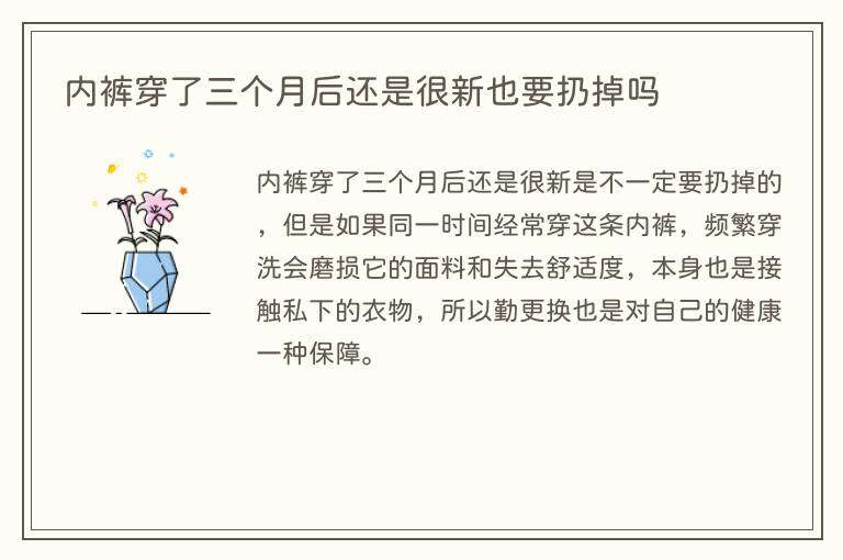 内裤穿了三个月后还是很新是不一定要扔掉的,但是如果同一时间经常穿这条内裤,频繁穿洗会磨损它的面料和失去舒适度,本身也是接触私下的衣物,所以勤更换也是对自己的健康一种保障。