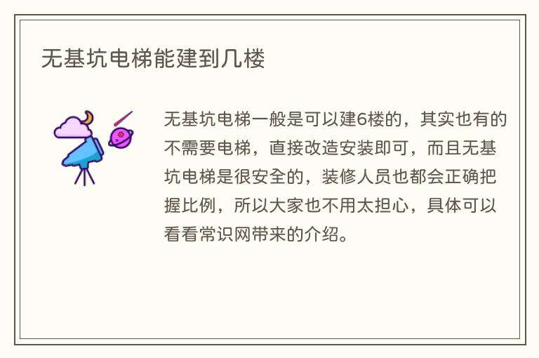 无基坑电梯一般是可以建6楼的,其实也有的不需要电梯,直接改造安装即可,而且无基坑电梯是很安全的,装修人员也都会正确把握比例,所以大家也不用太担心,具体可以看看常识网带来的介绍。