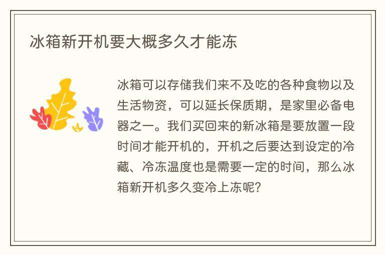 冰箱一般在开机10分钟左右,温度就会下降,起到降温的作用。 冷冻机第一次启动制冷需要很长时间,直到停止,一般为2小时。 建议新冰箱通电3-6小时左右,才能放入食物,可以有效防止油路出现问题。 新冰箱插上电源后,需要运行一段时间内不放任何物品,待温度下降后再放入物品,这样可以更好的保护冰箱。