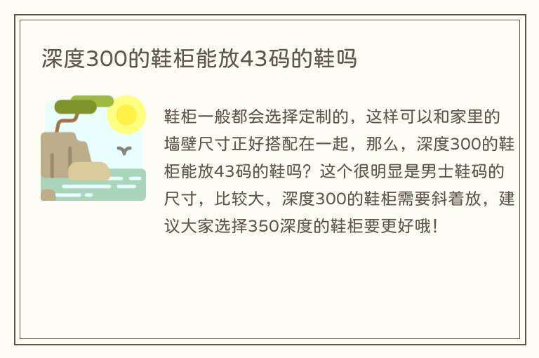 鞋柜一般都会选择定制的,这样可以和家里的墙壁尺寸正好搭配在一起,那么,深度300的鞋柜能放43码的鞋吗?这个很明显是男士鞋码的尺寸,比较大,深度300的鞋柜需要斜着放,建议大家选择350深度的鞋柜要更好哦!
