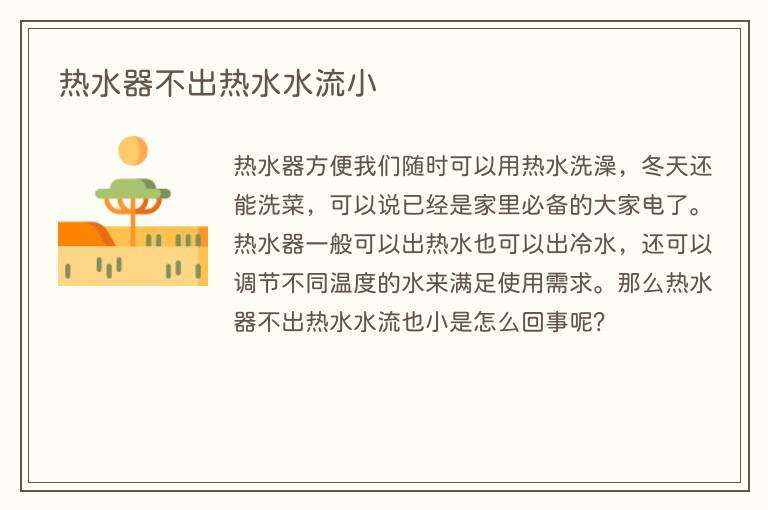 热水器方便我们随时可以用热水洗澡,冬天还能洗菜,可以说已经是家里必备的大家电了。热水器一般可以出热水也可以出冷水,还可以调节不同温度的水来满足使用需求。那么热水器不出热水水流也小是怎么回事呢?