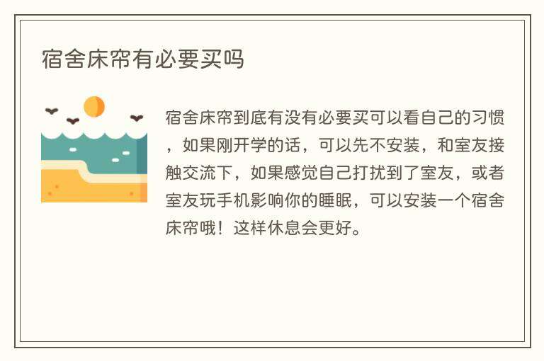 宿舍床帘到底有没有必要买可以看自己的习惯,如果刚开学的话,可以先不安装,和室友接触交流下,如果感觉自己打扰到了室友,或者室友玩手机影响你的睡眠,可以安装一个宿舍床帘哦!这样休息会更好。