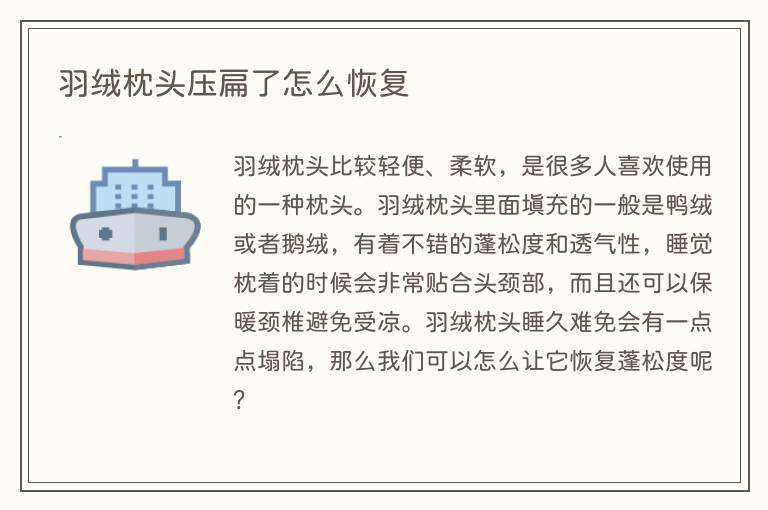 羽绒枕头比较轻便、柔软,是很多人喜欢使用的一种枕头。羽绒枕头里面填充的一般是鸭绒或者鹅绒,有着不错的蓬松度和透气性,睡觉枕着的时候会非常贴合头颈部,而且还可以保暖颈椎避免受凉。羽绒枕头睡久难免会有一点点塌陷,那么我们可以怎么让它恢复蓬松度呢?