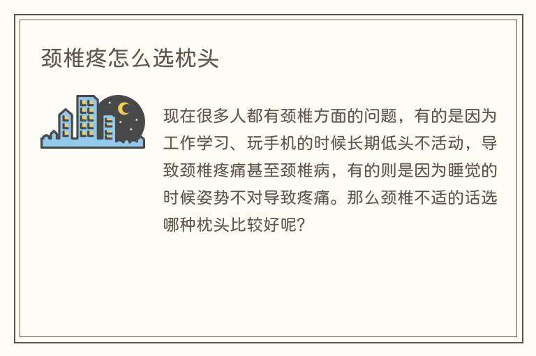 颈椎病在颈椎疼痛时最好选择有一定支撑力的枕头。 只有适当的支撑力才能支撑颈椎。 对于颈椎病患者,会有一定的辅助理疗作用。如果颈椎病不严重,尽量不要让脖子和肩膀着凉。 选择的枕头要符合颈肩的生理弧度,使用起来才会舒服。 对于重度颈椎病,建议使用支撑力更强,形状和材质效果更直接的,比如荞麦壳加中药等护颈枕,牵引作用更强。使用时可以听从医生的指示。