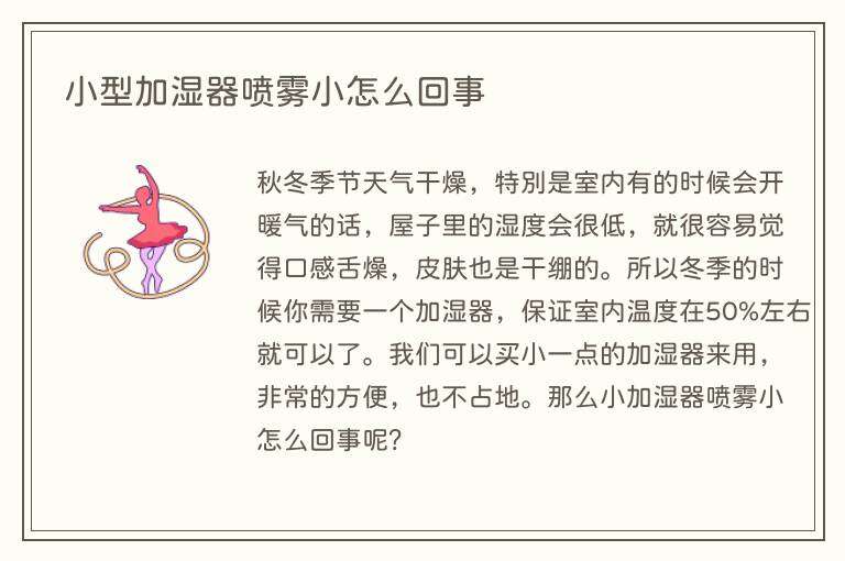 秋冬季节天气干燥,特别是室内有的时候会开暖气的话,屋子里的湿度会很低,就很容易觉得口感舌燥,皮肤也是干绷的。所以冬季的时候你需要一个加湿器,保证室内温度在50%左右就可以了。我们可以买小一点的加湿器来用,非常的方便,也不占地。那么小加湿器喷雾小怎么回事呢?