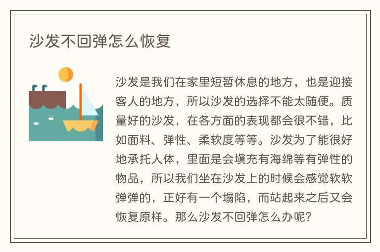沙发是我们在家里短暂休息的地方,也是迎接客人的地方,所以沙发的选择不能太随便。质量好的沙发,在各方面的表现都会很不错,比如面料、弹性、柔软度等等。沙发为了能很好地承托人体,里面是会填充有海绵等有弹性的物品,所以我们坐在沙发上的时候会感觉软软弹弹的,正好有一个塌陷,而站起来之后又会恢复原样。那么沙发不回弹怎么办呢?