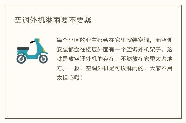 空调外机是可以淋雨的,空间外机的设计初衷就是装在室外,防水性能是很高的,外机的壳是镀锌钢板和绝缘漆做成的不容易生锈。所以装空调以后是不用担心空调外机的,只要保证外机安装稳妥就可以了,也不需要可以添加防雨棚。