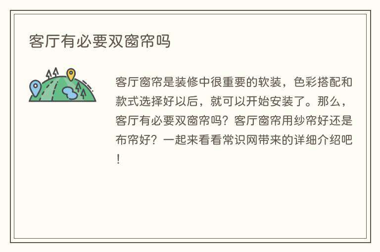 客厅窗帘是装修中很重要的软装,色彩搭配和款式选择好以后,就可以开始安装了。那么,客厅有必要双窗帘吗?客厅窗帘用纱帘好还是布帘好?一起来看看常识网带来的详细介绍吧!