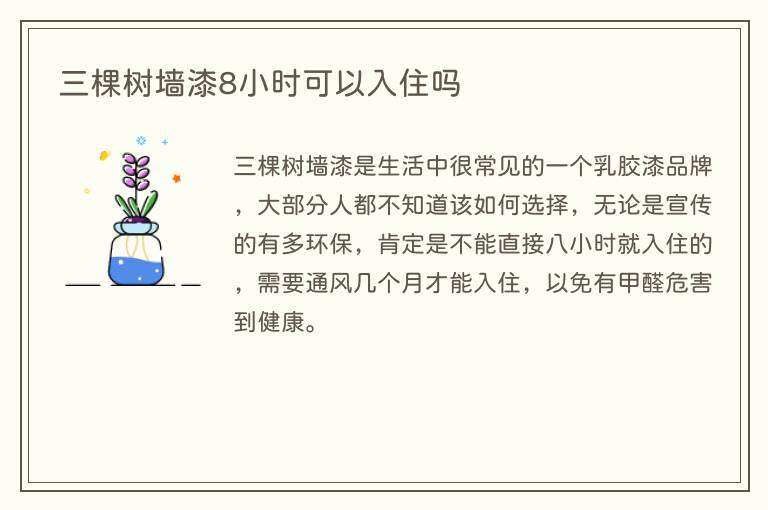 三棵树墙漆是生活中很常见的一个乳胶漆品牌,大部分人都不知道该如何选择,无论是宣传的有多环保,肯定是不能直接八小时就入住的,需要通风几个月才能入住,以免有甲醛危害到健康。