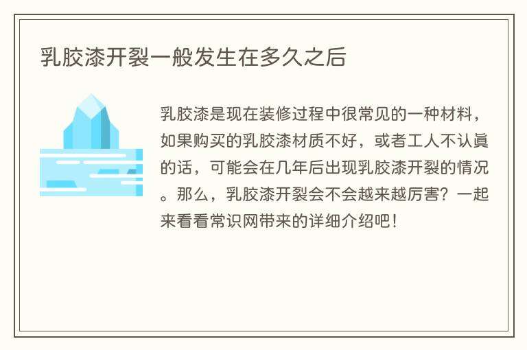 乳胶漆开裂一般发生在3-5年,但不代表这段时间内所有乳胶漆都会发生开裂的情况。一般乳胶漆的开裂时间与施工工艺、墙面的质量有一定的关系,比如墙面质量比较弱,如果质量较低,乳胶漆开裂发生在一年四季左右,建议在购买乳胶漆时,选用上知名品牌,以保证室内甲醛乳胶漆的质量不超过要求,同时保证乳胶漆的使用年限固定,减少开裂概率,保证美观大方。