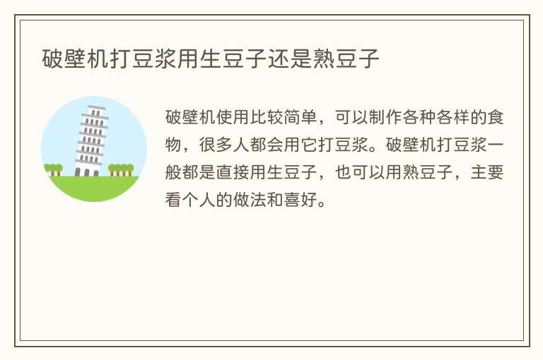 破壁机使用比较简单,可以制作各种各样的食物,很多人都会用它打豆浆。破壁机打豆浆一般都是直接用生豆子,也可以用熟豆子,主要看个人的做法和喜好。