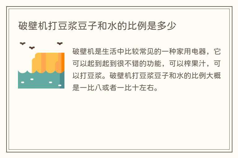 破壁机是生活中比较常见的一种家用电器,它可以起到起到很不错的功能,可以榨果汁,可以打豆浆。破壁机打豆浆豆子和水的比例大概是一比八或者一比十左右。