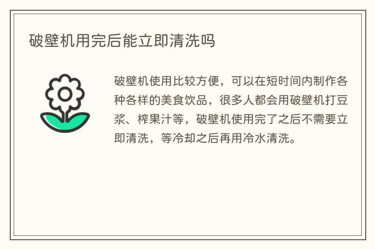 破壁机使用比较方便,可以在短时间内制作各种各样的美食饮品,很多人都会用破壁机打豆浆、榨果汁等,破壁机使用完了之后不需要立即清洗,等冷却之后再用冷水清洗。