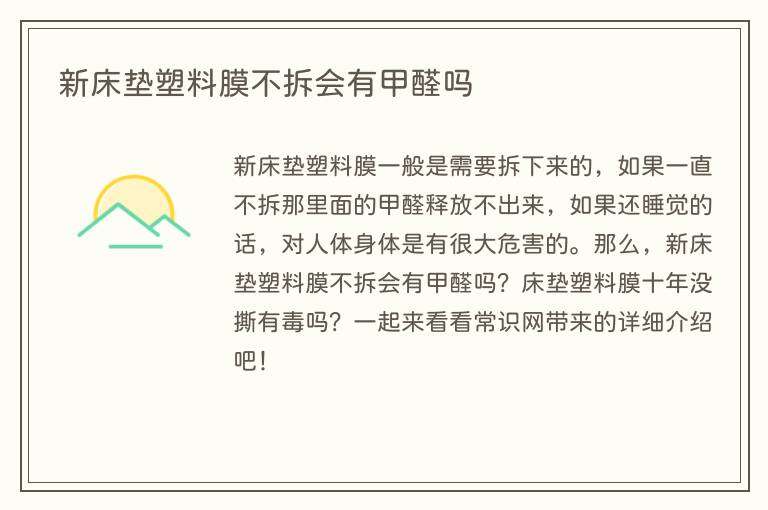新床垫塑料膜一般是需要拆下来的,如果一直不拆那里面的甲醛释放不出来,如果还睡觉的话,对人体身体是有很大危害的。那么,新床垫塑料膜不拆会有甲醛吗?床垫塑料膜十年没撕有毒吗?一起来看看常识网带来的详细介绍吧!