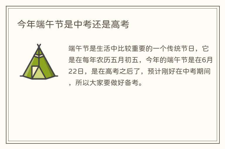 端午节是生活中比较重要的一个传统节日,它是在每年农历五月初五,今年的端午节是在6月22日,是在高考之后了,预计刚好在中考期间,所以大家要做好备考。