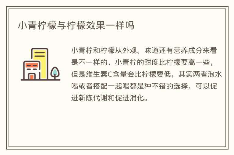 小青柠和柠檬从外观、味道还有营养成分来看是不一样的,小青柠的甜度比柠檬要高一些,但是维生素C含量会比柠檬要低,其实两者泡水喝或者搭配一起喝都是种不错的选择,可以促进新陈代谢和促进消化。