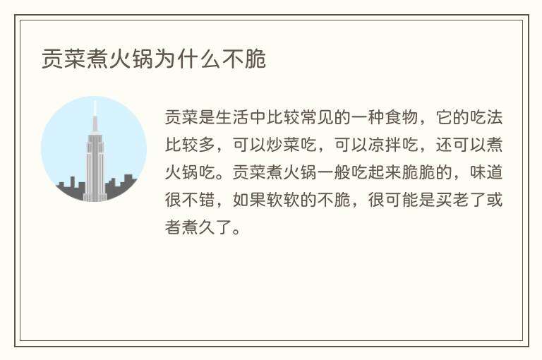 贡菜是生活中比较常见的一种食物,它的吃法比较多,可以炒菜吃,可以凉拌吃,还可以煮火锅吃。贡菜煮火锅一般吃起来脆脆的,味道很不错,如果软软的不脆,很可能是买老了或者煮久了。